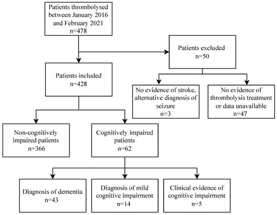 Between January 2016 and February 2021, 478 patients at the study hospital were identified to have had an acute ischaemic stroke and been thrombolysed. The 478 patients were collected from a total of approximately 5000 patients who were seen with ischemic stroke in the study hospital during the same time frame. Of the 478 assessed for thrombolysis, 50 patients were excluded because, even though it was suggested they were thrombolysed, we found no evidence of this, or thrombolysis treatment was definitely not administered, or ischaemic stroke was not the final diagnosis. An alternative diagnosis of seizure was given to three patients. Of the 428 stroke patients who underwent thrombolysis, 62 were cognitively impaired. These patients were further subdivided into the following groups: 43 patients with a definite diagnosis of dementia, 14 with mild cognitive impairment, and 5 with clinical evidence of cognitive impairment (Figure 1).