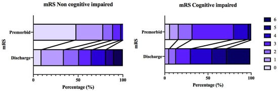 Displays morbidity outcome measures comparing the frequency distribution of premorbid and discharge mRS categorisations in the cognitively and non-cognitively impaired groups.