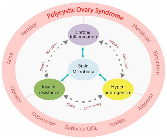 The central role of chronic systemic inflammation and metabolic dysregulation and their relationship to evolution, obesity, the microbiota, endocrine-disrupting chemicals, and the recently described “Hallmarks of Health” are described in the following sections of this review. There is a particular focus on the molecular details and mechanisms involved in the pathophysiology of PCOS.