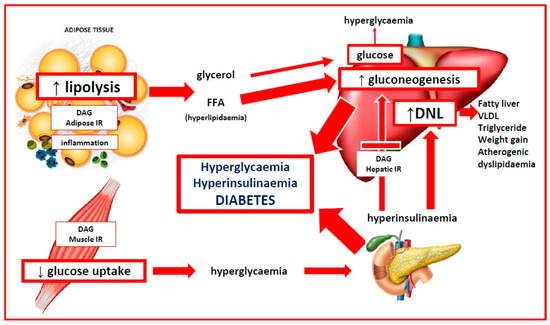 Pathophysiology of insulin resistance. Any of the causes listed above can impact insulin signalling pathways and lead to tissue-selective impairment of insulin action. Once insulin resistance occurs in muscle, glycogen synthesis and glucose uptake from the circulation are reduced. Since muscle constitutes approximately 50% of body mass, insulin resistance in muscle makes a significant contribution to hyperglycaemia. Insulin resistance in adipose tissue leads to impaired lipogenesis and continued lipolysis, with release of glycerol and free fatty acids into the circulation. Hepatic insulin resistance impairs glycogen synthesis and prevents insulin from inhibiting gluconeogenesis. Adipose lipolysis supplies substrates for continued hepatic gluconeogenesis. Together, the effects of decreased muscle glucose uptake, adipose lipolysis, and hepatic gluconeogenesis\result in hyperglycaemia. This causes the compensatory release of insulin from the pancreas and hyperinsulinemia. DNL, de novo lipogenesis; DAG, diacylglycerol; FFA, free fatty acid; IR, insulin resistance; VLDL, very low-density lipoprotein.