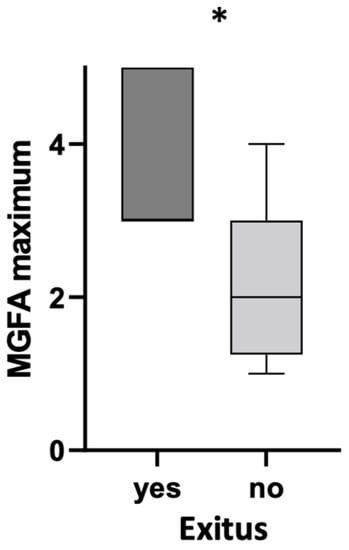 Boxplots showing maximum MGFA (Myasthenia Gravis Foundation of America) class that was reached in clinical history in non-vaccinated deceased and surviving patients. *: p < 0.05.