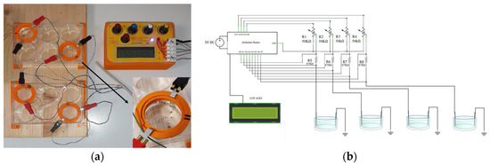 Electrical stimulator specifically designed for the foraminiferal (i.e., Amphistegina lessonii) experiment. (a) Picture of stimulus device that is connected to four pairs of electrodes and a section of the well. (b) Wiring diagram of the stimulator.