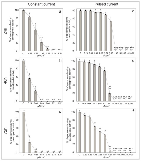After 3 days of stimulation, the percentage of individuals that clearly exhibited a stream of pseudopodia were counted as living, all the others were counted as non-living individuals. With the increasing electric current density of both the constant and pulsed current, the percentage of individuals showing pseudopodial activity decreased (Figure 2 and Table S2).