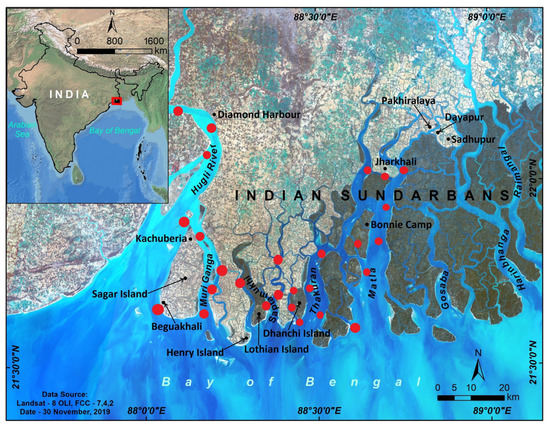 The Indian Sundarbans mangrove ecosystem and the adjacent estuaries. Black dots refer to the study locations, and the red dots denote the sites sampled in different studies and considered in this review article. The inset map shows the location of the Indian Sundarbans.