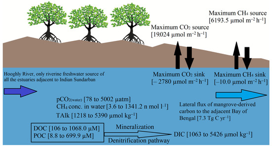 Carbon parameters (DIC, DOC, and POC concentrations), TAlk, and other physicochemical parameters can regulate CO2 and CH4 fluxes. Researchers have extensively used the bulk formula method to estimate air–water CO2 and CH4 exchange rates in the Indian Sundarbans [83,84]. Computation of pCO2(water) requires SST and sea surface salinity data, along with knowledge of DIC and TAlk (expressed in moles per kilogram of seawater), because the concentration of DIC and TAlk remains constant with changes in water temperature and pressure [85]. Different biogeochemical processes can influence the concentration of DIC in an aquatic system. Cycling of DIC is related to the production and utilization of CO2 through photosynthesis and respiration, i.e., the metabolic state of an estuary [86].