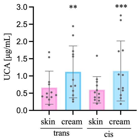 From the sample obtained of tape-stripped non-treated SC, the trans-UCA concentration found within the 10 tapes/subjects was 0.6601 ± 0.4817 μg/mL, while in the SC treated with the emollient emulsion treatment was 1.1186 ± 0.7525 μg/mL, being the ratio equal to 1.69 (trans-UCA SC treated/non-treated SC). Considering the cis-UCA, non-treated SC samples had a concentration of 0.5985 ± 0.3816 μg/mL, and the one found in the treated SC was 1.1452 ± 0.8705 μg/mL (ratio of 1.91; cis-UCA SC treated/skin without cream (non-treated SC)). Figure 1 illustrates the trans- and cis-UCA quantified among the SC samples–Wilcoxin matched-pairs signed rank test (two tailed, n = 12, α = 0.05).