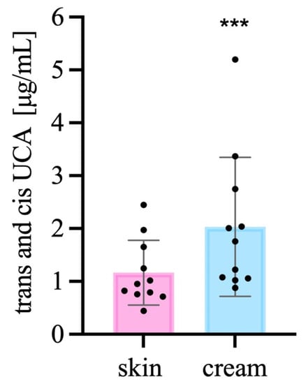 Total UCA quantification in the SC and SC + emollient emulsion. *** p < 0.001, n = 12.