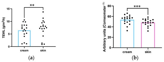 Influence of the emollient emulsion in the skin barrier function: (a) TEWL (b) skin superficial hydration. ** p = 0.005 (a); *** p < 0.001 (b); n = 18.