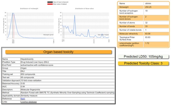 For the prediction of various toxicity endpoints of citrinin (PubChem CID: 54680783), such as acute toxicity, hepatotoxicity, cytotoxicity, carcinogenicity, mutagenicity, immunotoxicity, adverse outcome pathways (Tox21), and toxicity targets, ProTox-II (https://tox-new.charite.de/protox_II/, accessed on 15 January 2023) was used. ProTox-II incorporates molecular similarity, pharmacophores, fragment propensities, and machine-learning models. The predictive models are based on data from both in vivo instances and in vitro assays, such as the Tox21 assay, the Ames bacterial mutation assay, the hepG2 cytotoxicity assay, and the immunotoxicity assay (e.g., carcinogenicity, hepatotoxicity). The models have performed well and have been validated on separate external sets. The predicted median fatal dosage (LD50) was obtained in mg/kg weight along with the toxicity class, and the prediction accuracy [25].