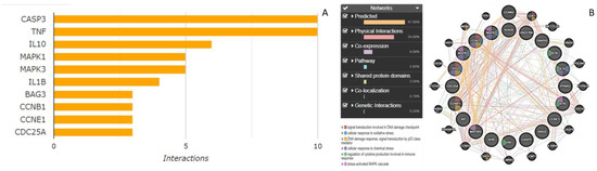 A network of protein–protein interactions and pathways implicated through (A) CTD and (B) GeneMANIA. In total, 41.5% of genes showed physical interactions and 23.54% were coexpressed and 28.67% were predicted to interact with each other. Caspase-3 and TNF showed 10 interactions and 5 interactions were shown by IL-10 and MAP kinases.