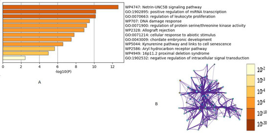 Our results are consistent with the findings from previous studies on cell lines reporting that the inhibition of the JNK signaling pathway improves cell viability in response to oxidative stress [44]. To fully comprehend the relationship between genes and disorders, Metascape was utilized to simultaneously assess important genes for pathway enrichment and functional annotation of genes. Metascape using the EggNOG and Homologene databases gave a mechanism of all the transcription factors and pathways implicated with the appropriate p-values. Hypergeometric accumulative distributions recorded p-values to collect datasets and enrichment factors. Citrinin targets the DNA damage response, positive regulation of miRNA transcription, modulation of the netrin–UNC5B signaling pathway, leukocyte proliferation regulation, etc. Multiple malignancies have been linked to UNC5B signaling, which boosts cell survival when its ligand netrin-1 is present and promotes cell death when it is not. Additionally, it has been noted that blocking the ligand reduces tumor invasiveness and angiogenesis [45]. Citrinin was significantly associated with neutrophilia, squamous cell carcinoma, Fanconi anemia, leukemia, hepatoblastoma, and fatty liver diseases. According to the Kappa-statistical similarity between the gene memberships of significant pathways, a tree was hierarchically clustered (Figure 4A), and a threshold of 0.3 kappa was used to divide the tree into word clusters. A subset of representative terms from the full cluster was converted into a network layout where each term was represented by a circle node with a size proportional to the number of input genes that fall under this term. The nodes of the same color showed the same cluster identity, and the thickness of the edge represented the similarity score (Figure 4B).