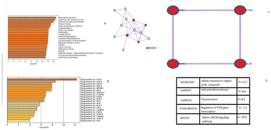 GO enrichment analysis with biological meanings. (A) The predicted disease outcomes by citrinin exposure; (B) the transcription factors implicated in disease outcome; (C) the MCODE algorithm identifying densely connected proteins; (D) the top five best p-value terms were retained and disease outcomes with these top significant p-values are shown in the table.