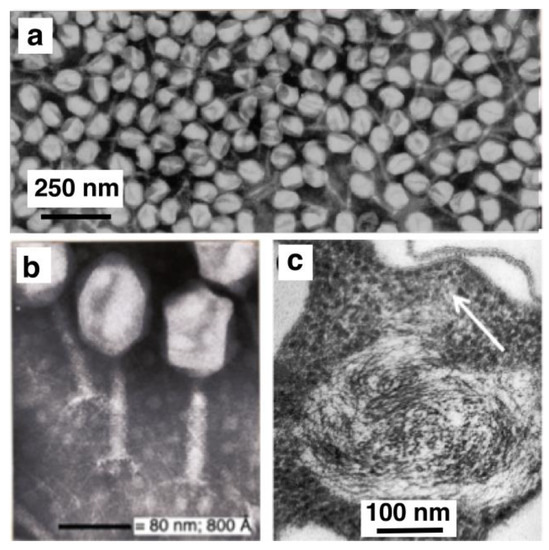 In 1966, the preparation of T2-phages that I purified during my master’s degree program was photographed at the Laboratory of Electron Microscopy in Amsterdam by Nanne Nanninga (Figure 1a,b). The preparation was pure and satisfied the director, Dr. Woutera van Iterson, who consequently accepted me later as a Ph.D. student. I also remember how van Iterson and I looked together at the pictures of highly magnified photographs of thin sections of Escherichia coli cells, fixed by the Ryter–Kellenberger method [1], in which aggregated DNA threads and poly-ribosomes can be distinguished. As in the case of mesosomes in Bacillus subtilis (see below), van Iterson saw in the continuation of DNA threads through the cytoplasm towards the plasma membrane (arrow in Figure 1c), a confirmation of the first model for bacterial DNA segregation, in which Jacob, Brenner and Cuzin [2] proposed a connection between DNA and the plasma membrane.