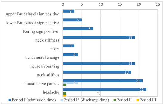 The analysis showed headaches (22 patients), cranial nerve paresis (21 patients), nausea/vomiting (19 patients), and neck stiffness (19 patients) as the most common clinical symptoms observed in NB children in period I. In the majority of cases, the mentioned symptoms disappeared in period II. Headaches were reported by one patient and cranial nerve paresis by one patient. Only one patient reported headaches in the period III. The percentage distribution of abnormalities found in NB patients is shown in Figure 1.