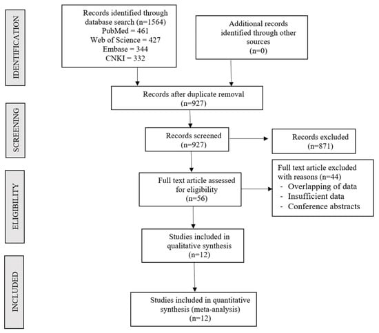 A total of 1564 articles were retrieved from the literature search, which upon duplicate removal resulted in 927 articles. After the initial title and abstract screening process, 871 of them were excluded resulting in 56 potential articles for full-text screening. Forty-four articles were removed due to insufficient data, overlapping data, and studies published only as conference abstracts. Finally, we selected 12 articles [18,19,20,21,22,23,24,25,26,27,28,29] with 1728 patients for inclusion in the analysis. The PRISMA flow diagram of the selection process was presented in Figure 1. The general characteristics of the included studies are summarized in Table 1.