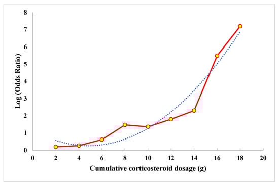 Dose–response Meta-analysis: Twelve studies [18,19,20,21,22,23,24,25,26,27,28,29] were included in the dose–response meta-analysis. We noted significant heterogeneity among the included studies (i2 = 96.8%, p < 0.001), hence, we used the random effects model of dose–response meta-analysis as shown in Figure 3. The summary OR of osteonecrosis was 1.16 (95% CI 1.09–1.23, p < 0.001) per 2.0 g increase in cumulative CS usage. The relationship was non-linear polynomial as shown by the restricted cubic spline curve in Figure 4. It is evident from the spline curve that the risk of OFH rises once the cumulative dose of the CS used rises above 4 g.