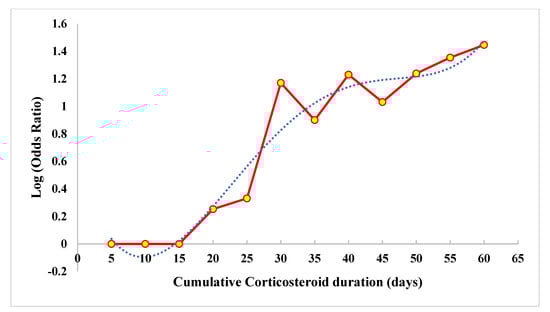 Duration–response Meta-analysis: Four studies [20,25,26,27] were excluded from the analysis since they did not provide the cumulative duration of CS usage. Eight studies [19,21,22,23,24,26,28,29] were included in the duration response meta-analysis. We noted significant heterogeneity among the included studies (i2 = 92.4%, p < 0.001), hence, we used the random effects model of dose–response meta-analysis as shown in Figure 5. The summary OR of osteonecrosis was 1.02 (95% CI 1.01–1.03, p < 0.001) per 5 days of increase in the cumulative duration of CS usage. The relationship was non-linear polynomial as shown by the restricted cubic spline curve in Figure 6. It is evident from the spline curve that the risk of OFH rises once the cumulative duration of the CS treatment is more than 15 days.