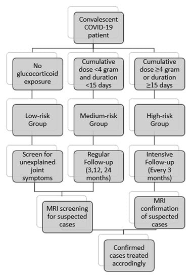 - Li, W.; Huang, Z.; Tan, B.; Chen, G.; Li, X.; Xiong, K.; Zhu, R.; Li, R.; Li, S.; Ye, H.; et al. Assessment and Management on the Risk of Glucocorticoid-Induced Osteonecrosis after COVID-19; Social Science Research Network: Rochester, NY, USA, 2021. [Google Scholar]