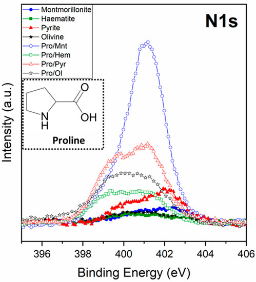 Therefore, in this complex context, these experiments are focused on understanding how an amino acid, proline, interacts with different mineral surfaces (relevant in prebiotic chemistry) due to their different functionalities or capacities. Surface science tools such as XPS have been used to study pyrite surface-driven molecular chemistry [33,34], and understanding the reactivity of molecule-pyrite surface systems has been improved by using a wide range of studies characterized by powerful and innovative spectroscopy techniques. These techniques have perhaps been the most useful in establishing the structure of the pristine pyrite surface and molecule/pyrite interaction. However, despite their importance, few spectroscopic studies have been performed on molecular interactions on other mineral surfaces. It is well known that the adsorption of organic molecules or biopolymers on mineral surfaces may substantially modify mineral morphology and surface composition and reactivity, thereby tailoring their properties [35]. Therefore, surface science techniques are very promising tools to study these molecular processes on catalytic mineral surfaces to obtain molecular information.