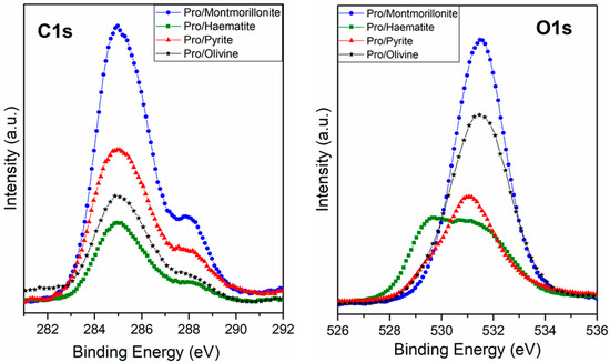 In our case, L-proline yields a clearly differentiated spectroscopic fingerprint on the core level spectra of N1s, C1s, and O1s, the latter of which are shown in Figure 2. The comparative study of the C1s core level spectra among different minerals confirms that L-proline has a high affinity for montmorillonite, whereas for iron disulphide, olivine, and haematite, it exhibits a lower molecular affinity. Moreover, although the intensity of the signal changes in each experiment, the profile of the spectra is similar for the four samples. In the case of the O1s spectra, the contribution of the mineral structure to this region of the spectrum needs to be considered; in particular, iron oxides, iron silicates, and iron sulphates (all oxygen-bearing minerals) confer relevant changes in the profile of the spectrum related to the chemical composition of each mineral under study.