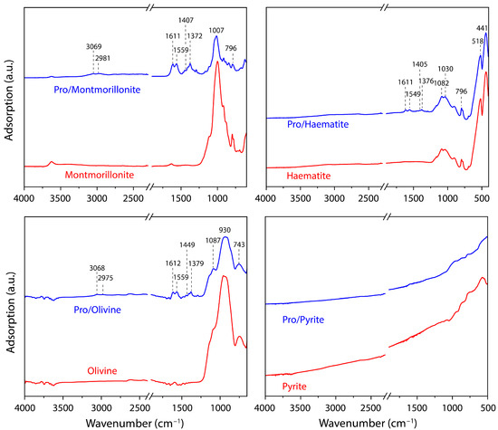 ATR-FTIR spectra for the minerals (red curves) and proline/mineral systems (blue spectra).