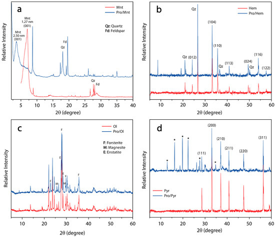 XRD diffractograms of the four cases of study: Pro/Mont (a), Pro/hem (b), Pro/Ol (c), and Pro/Pyr (d) in blue and their corresponding control samples in red. The measured diffraction peak positions and intensities are a fingerprint-like of a particular crystalline phase. Sharp and narrowed peaks at the XRD pattern indicate certain degree of crystallinity, whereas broad peaks denote amorphous materials, such as the (001) lattice plane in both montmorillonite cases.