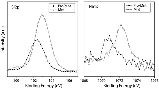 Figure 5 shows the spectrum of silicon (Si2p), the main chemical element in the montmorillonite structure, with a binding energy at 102.9 eV (assigned to the silicate species). After molecular adsorption, the intensity of the spectrum decreases, which can be due to amino acid adsorption on the surface, which attenuates the signal of the mineral. The same behaviour is observed for sodium, as the signal decreases after proline adsorption.
