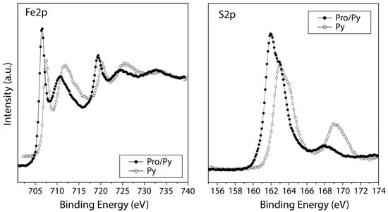 Finally, the XRD diffractograms of the pyrite samples (Figure 4d) were recorded. As expected, the sample in the absence of proline displayed the typical pyrite pattern [75] showing six intensive peaks (111), (200), (210), (211), (220), and (311) (Figure 4d, red); however, due to oxidation, six new peaks (denoted with an asterisk) arise and are attributed to Rozenite (FeSO4 · 4H2O) formation. This is in agreement with the observed XPS spectra of pyrite (S2p). On the other hand, when pyrite is in the presence of proline, the oxidation of FeS2 is prevented. This is also confirmed using XPS spectroscopy show at the 3.2.2. Iron Disulphide section.