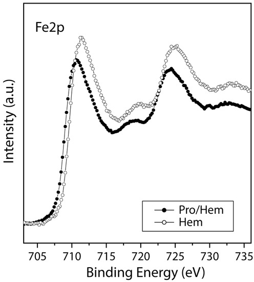 In the case of the Pro/Pyr system, the XPS analysis shows the same three components for the C1s peak at 284.2 eV, 285.9 eV, and 288.2 eV binding energies (B.E.), assigned to the CH plus adventitious carbon, to the C-N groups, and to the carboxylate (COO−) or carboxylic (COOH) group, respectively. In the O1s peak, two components were found, one each at 529.6 eV (assigned to the iron oxides) and at 531.0 eV, which has been assigned to the carboxylate group and an adventitious component, respectively [63,64,65]. The N1s core level also presents two components, at 399.5 eV (65%) assigned to NH species and the second at 401.1 eV (35%) assigned to the NH2+ species; accordingly, the proline molecule is present in different chemical forms, the anionic (65%) and the zwitterionic form (35%), and pyrite seems to enhance the anionic adsorption with respect to the zwitterionic form. Cystine also exhibits the same behaviour, and there is a preference of the anionic form to be sorbed on a pyrite surface, as described previously [46]. XPS analysis for the proline/olivine system shows the same three components for the C1s peak, which were observed at 284.5 eV, 285.9 eV, and 287.8 eV binding energy (B.E.) assigned to the CH and adventitious carbon, to the C-N groups, and to carboxylate (COO−) or carboxylic (COOH) groups, respectively. Regarding the O1s peak, two components were identified at 529.4 eV (assigned to iron oxides) and at 531.0 eV, which have been assigned to the deprotonated carboxylic group (carboxylate group) and adventitious oxygen. The N1s shows two components, at 399.5 eV (57%) assigned to NH species, and the second at 401.3 eV (43%), which is assigned to the NH2+ species; therefore, in this case, the molecule also presents two different chemical forms as well as in the case of pyrite. In both surfaces, the sorbed proline is predominantly in the anionic form over the zwitterionic form. However, in the case of iron disulphide, the percentage of anionic adsorption increases slightly with respect to the olivine surface.