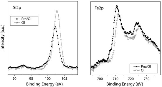 Figure 8 shows the spectra of silicon (Si2p) and iron (Fe2p), both chemical elements present in the structure of basaltic olivine, the former with a binding energy at 103.2 eV assigned to the silicate species and the latter at 710.7 eV assigned to iron oxides. After molecular adsorption, the intensity of the silicon spectrum slightly decreases, while that of iron is hardly attenuated at all; this result means that the proline molecule has a preferential affinity for silicon rather than iron atoms. Furthermore, low adsorption occurs on the surface of the olivine mineral, as depicted previously in the comparative mineral study (see Figure 1).