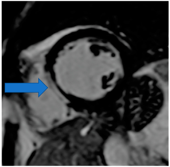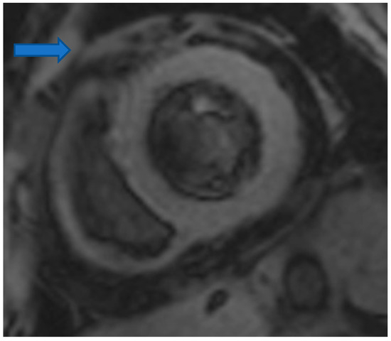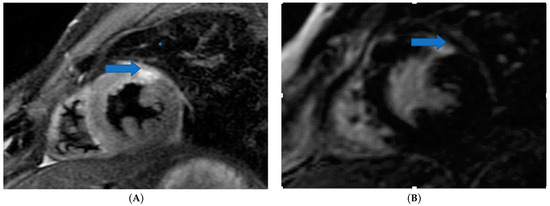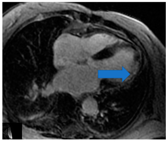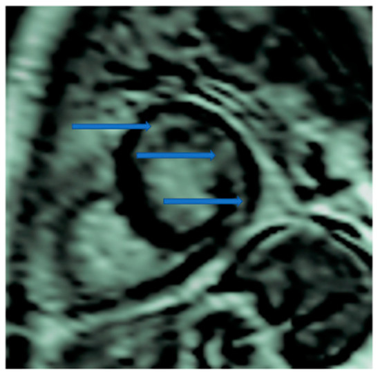 CMR is the only non-invasive imaging modality capable of providing fibrosis information equal to that provided by myocardial biopsy [149]. In this regard, CMR can assess replacement fibrosis using late gadolinium T1-enhanced imaging (LGE) (subendocardial, due to CAD in Figure 2, and subepicardial, due to inflammation in Figure 3, respectively). However, IA may also present diffuse myocardial fibrosis with or without concurrent LGE. Diffuse fibrosis can be detected using native T1 mapping and extracellular volume fraction (ECV) quantification. These indices have a good correlation with the results of the myocardial biopsy, and native T1 mapping can also be used as a non-contrast index of fibrosis in those patients with contraindications to paramagnetic contrast agents [149]. Currently, there are no evidence-based data regarding the role of various imaging modalities in the prevention, diagnosis, and treatment assessment of ARDs. However, a consensus-based decision algorithm for when a CMR study could be considered in patients with autoimmune rheumatic diseases (ARDs), together with a standardized study protocol, has recently been published [149]. Representative CMR images from various clinical scenarios are included in Figure 2, Figure 3, Figure 4, Figure 5 and Figure 6.