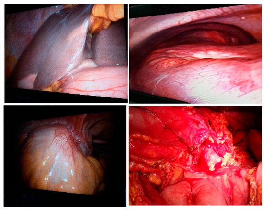 Diagnostic laparoscopy and conversion—the presence of liver metastases (top left and right), parietal invasion (bottom left) or perforated tumor (bottom right) is observed.