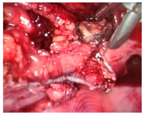 After the dissection, there is time to section the digestive tube with a blue or green stapler, 60 mm, articulated, 5 cm below the tumor (intraoperative endoscopy can be useful, if we do not notice the tumor) (Figure 3).