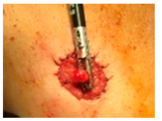 The colorectum to be resected is exteriorized through the trocar hole in the left iliac fossa, placed on the colostomy site, by traction with the Babcock forceps, with a protective bag for the abdominal wall (Figure 4).