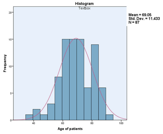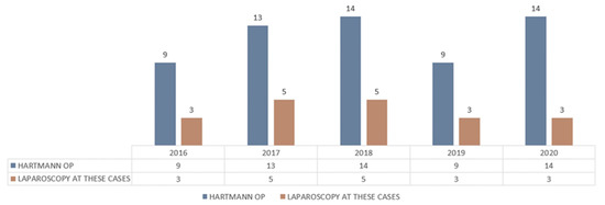 The mean age of patients operated on with intestinal occlusion in the years 2016–2020 in our clinic was 70 years old for the Hartmann open approach for tumor occlusion (range 37–91 years), 80 years old for classically operated non-tumoral occlusion and 69 years for those laparoscopically operated for both tumoral and non-tumoral occlusion. The mean age for laparoscopic Hartmann procedure was 69 ± 11.43 years (range 37–91 years) (Figure 13).
