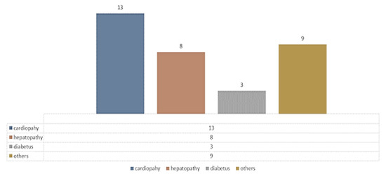 ASA was, for in the majority of patients, in risk class III (for Hartmann, ASA III risk = 49c (56.30%), ASA II = 32c (36.78%)). The distribution of preoperative comorbidities in Hartmann patients can be seen in Figure 14, where heart disease and hypertension predominate.