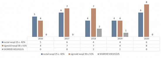 The parity of sigmoid cancer/rectal cancer was according to Figure 15, where it can be seen that sigmoid neoplasms tend to exceed rectal ones in patients who came to the emergency room and underwent Hartmann surgery.