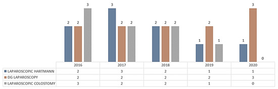 At The First Surgery Clinic, between 2016 and 2020, out of 985 operations for intestinal and colonic occlusion (7.15% of the total operations in the clinic), 531 (54%) were non-tumor occlusions and 454 (46%) were occlusive tumors (88 Hartmann operations). Of these, 7.3% were laparoscopically performed (7 laparoscopic Hartmann operations and 23 were diagnostic laparoscopies) (Figure 12).