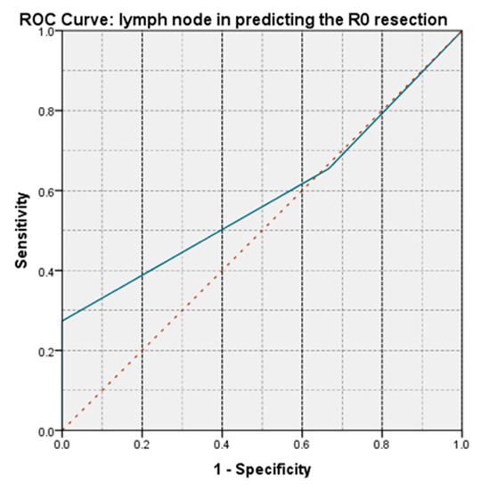 For all patients with N0, an R0 resection was obtained. The aspect of the ROC curve and the value of AUC = 0.585 demonstrate that lymph node invasion has a low-moderate power of prediction on obtaining an R0 resection (Figure 18).