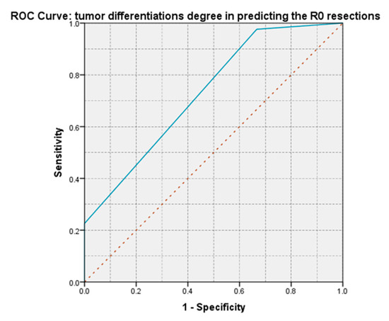 For all patients with well-differentiated tumors, an R0 resection was obtained, while for those with poorly differentiated tumors, this was possible in a proportion of 6.66%. The appearance of the ROC curve and the AUC = 0.730 value demonstrate the degree of tumor differentiation; it has a moderate predictive power on obtaining an R0 resection and can be used as a predictive marker (Figure 19).
