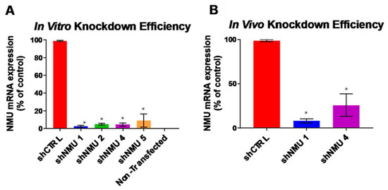 Targeting and knockdown efficiency of Nmu. (A) 90–95% knockdown of in vitro Nmu in HEK293 cells is accomplished using each of the shNMU hairpins tested. shNMU 1 and shNMU 4 had the highest in vitro knockdown percentages at 97.4% and 95.4%, respectively. (B) In vivo knockdown of endogenous Nmu in the LH is achieved using AAV-shNMU, with AAV-shNMU 1 knocking down ~92% of Nmu in the LH. Means ± SEM. for independent experiments (n = 3) rep-resented in (A,B). * indicates p < 0.05 by one-way ANOVA with Bonferroni correction against shCTRL.