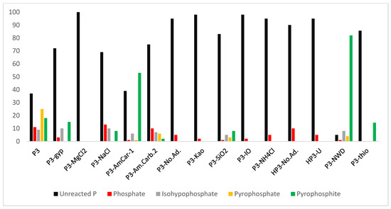 Yields (abundances (%)) of various condensed P compounds in various samples. Where unreacted P means the starting P source, which in this case is either phosphite or phosphorous acid. The Y-axis represents the abundance (%), whereas the X-axis represents the various samples.