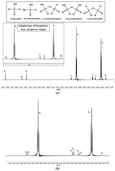 H-coupled 31P-NMR analysis confirmed isohypophosphate [PPi(III–V)] in the form of three doublets in the −3.0 to −6.0 ppm region, as reported previously [27]. The peaks in our results were slightly shifted from the previously reported values: −2.5 to −7.0 ppm [27], to −3.0 to −6.0 ppm. This slight shift in the location of the peak and chemical shift values was attributed to the pH changes [42]. Peak c (isohypophosphate) [PPi(III–V)] was identified by the following coupling constant values [27]: δ–4.44 [dd, c1JPH = 645 Hz, c1JPP = 17.36 Hz, Pi(III)]; δ–5.50 [d, c2JPP = 17.22 Hz, Pi(V)]. These values are within the range as reported previously [27]. Pyrophosphite [Ppi(III)] was identified as two triplets in the H-coupled mode of 31P-NMR; one triplet around −3.6ppm and the other around −6.5 ppm, as also reported previously [27]. Peaks e (pyrophosphite) at δ–5.05 [dd, c3 JPH = 660 Hz, PPi (III)] correspond to phosphite triplet splitting (Figure 2a,b).