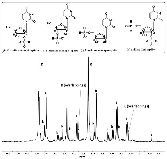 The formation of the organophosphorus compounds was improved by the presence of urea (Table 4). Heating uridine with an aqueous solution of phosphite [Pi(III)] and urea produced various uridine phosphites. Figure 3 (Sample B) shows 31P-NMR analysis of Sample B in H-coupled mode. Various uridine phosphite species were identified and characterized by observing their chemical shift values; C-O-P (carbon, oxygen and phosphorus) and P-H interactions [43]. Figure 3 shows the various P species, including both organic and inorganic P compounds, and is without any spiking with the standard compounds. In the reaction sample B, we did not observe any organophosphates. However, various species of uridine phosphites were observed. The organophosphite 5′-uridine phosphite (peak g) was identified in the form of two triplets around 5.2 and 7.8 ppm; 2′- and 3′-uridine phosphites (peaks i) were identified as two doublets. Various other doublets and triplets labeled as peaks k represent uridine diphosphite species. These uridine diphosphite species (peaks k) represent uridine-P species having one phosphite group attached to 5′- position and another either to 2′- or to 3′-positions but not through a pyrophospite [PPi(III)] (P-O-P) type linkage. Each triplet and a doublet, in the case of phosphite, [Pi(III)] splits further into another triplet and a doublet, representing uridine-diphosphite species. The total yield (% abundance) of organophosphite in the case of uridine was 99%. When phosphite [Pi(III)] was heated without urea (Sample A), the yields (% abundances) of the uridine phosphates and phosphites were lower. These yields represent the relative abundances (%) of the phosphonylated/phosphorylated products and were calculated on the basis of the total P dissolved and by the peak integration method as reported before [24,25,26].