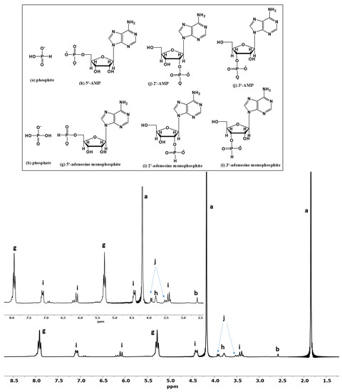 H-coupled 31P-NMR of phosphorylation and phosphonylation reactions of adenosine (Sample F). The labeled peaks represent the following compounds: (a) phosphite, (b) phosphate, (g) 5′-adenosine phosphite, (h) 5′-AMP, (i) 2′and 3′-adenosine phosphites, and (j) 2′and 3′-AMP.