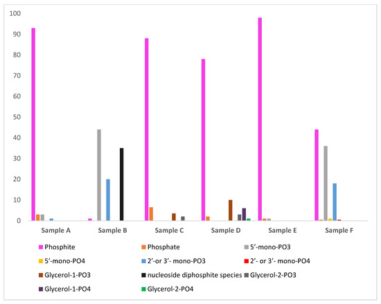 The relative abundances (%) of the phosphonylated and phosphorylated as well as amount of inorganic phosphate (oxidation product of phosphite) observed in each sample. Where Samples B, D, and F where with urea as an additive, and Samples A, C, and E were without urea. The relative abundances (%) were calculated using the peak integration method of 31P-NMR [24,25,26].
