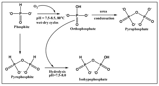 Recent studies have shown that despite its reactivity, phosphite ([Pi(III)]) can be stable enough to be detected in various natural environments [26]. It is therefore highly likely that this reduced P compound would have played an important role in the prebiotic P chemistry. Kee and colleagues suggested that phosphite ([Pi(III)]) would have played a significant role in the formation of reactive condensed inorganic P compounds including pyrophosphite ([PPi(III)]), isohypophosphate ([PPi(III–V)]), and pyrophosphate ([PPi(V)]), with the more energetically accessible pyrophosphite ([PPi(III)]) enabling the formation of pyrophosphate ([PPi(V)]) via an isohypophosphate ([PPi(III–V)]) intermediary [27]. Condensed P compounds, including pyrophosphate ([PPi(V)]), play an important role in biochemistry.