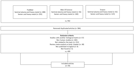 A full search was performed in online databases related to the issue under study to achieve an accurate bibliometric and bibliographical analysis and to be aware of the bibliographic load indexed in each one of the online databases. We selected Scopus, PubMed, and Web of Science (WOS) as databases. The search was performed, as previously described, using the “Boolean” system which allowed us to identify the studies of interest to construct this review using the following combinations of keywords: “Seminal Plasma and Heavy Metals” and “Semen and Heavy Metals” in each of the databases (accessed from 4 November 2021 to 14 April 2022).