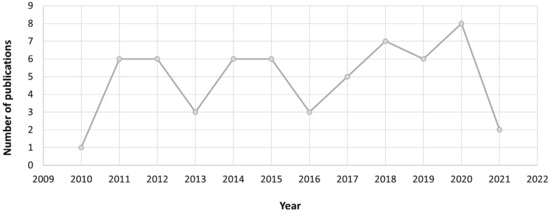 The number of publications by year (January 2010–December 2021), including all the database articles created after the application of inclusion and exclusion criteria.