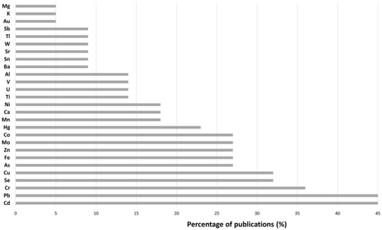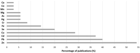 The most quantified analytes by AAS were Zn (54%), Pb (40%), Cd (37%), and Cu (29%) as shown in Figure 4. Cu, Se, and Fe were quantified by AAS in a great number of articles too. However, important heavy metals that also have a negative impact on male fertility such as Hg and As analytes were minimally measured by AAS.